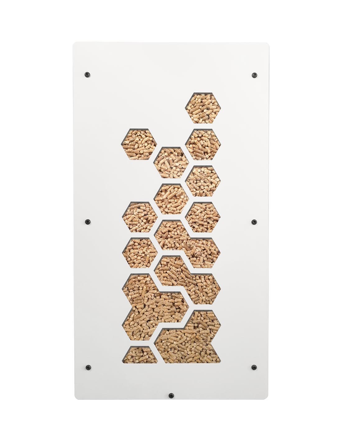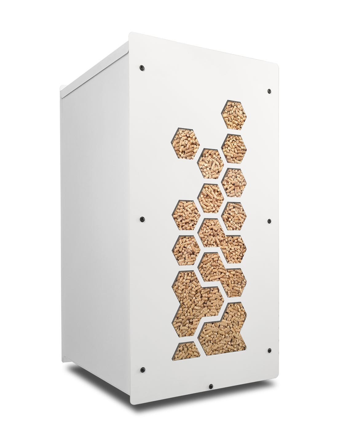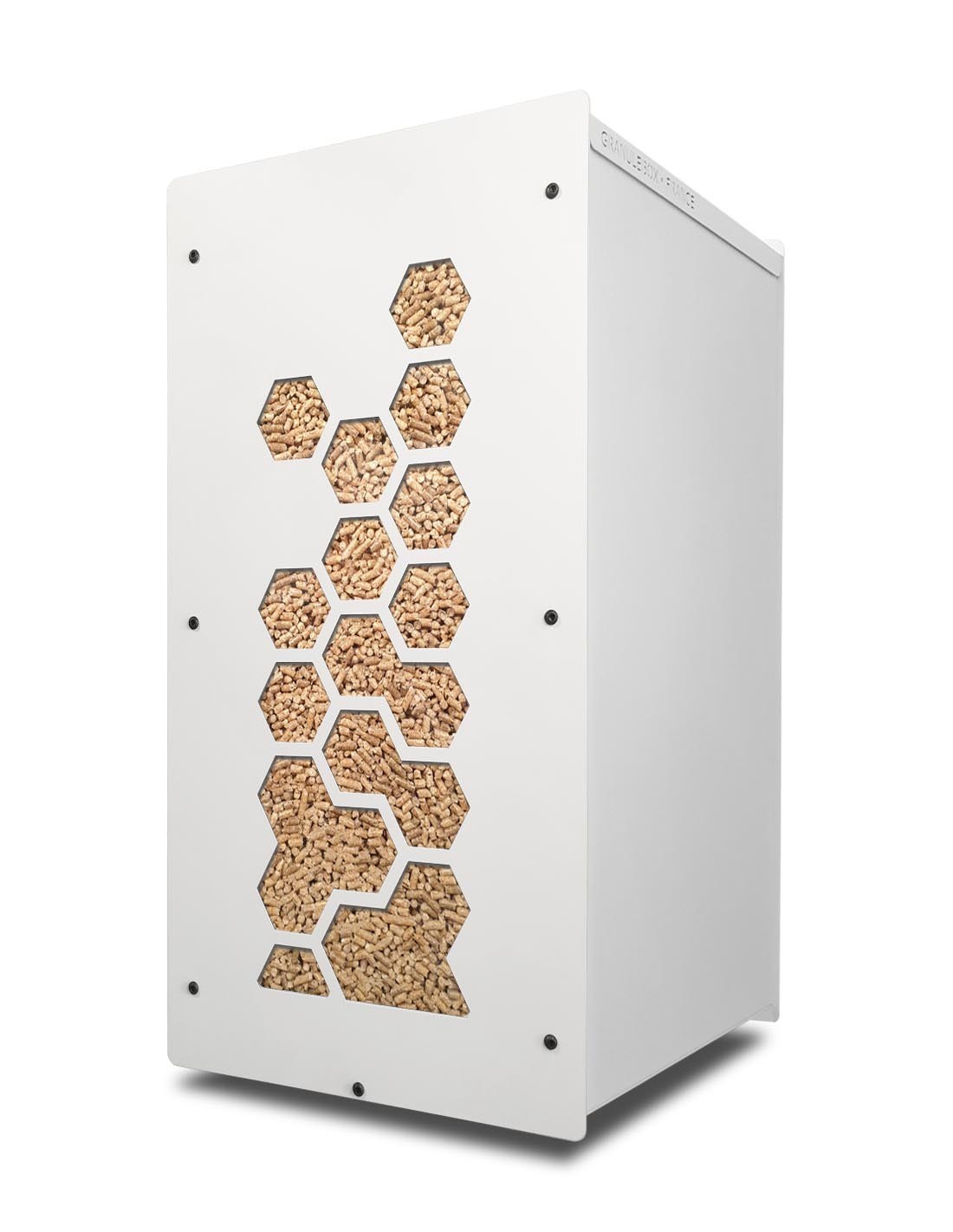 - A decoration with octagonal shapes inspired by beehives and a white epoxy paint, a pellet box that knows how to match your decorative desires.