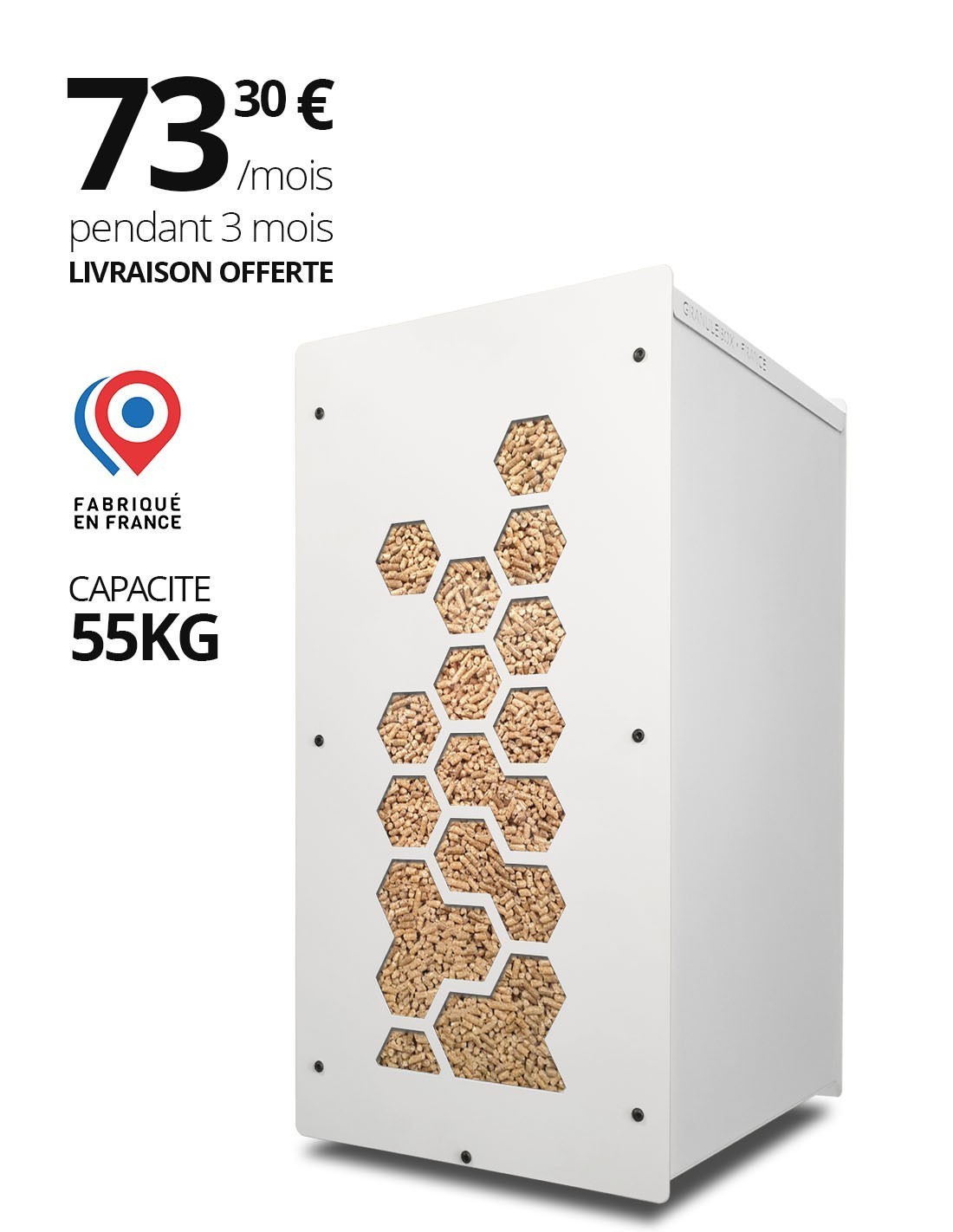 It is in our premises in the Rhône Alpes region that we imagined this original decoration for your pellet box. The octagons on the front of your white Granulebox Octo are reminiscent of bee hives, and the white color of this pellet storage cabinet is distinguished by its elegance, so take care of your interior by opting for a Made in France pellet box. You can then store 55 kilos of wood pellets and protect them from moisture. With its reduced capacity (55 kilos) or in its XXL size as with this Granulebox, each of our pellet boxes helps to increase your energy efficiency. Save money while decorating your interior with class.
