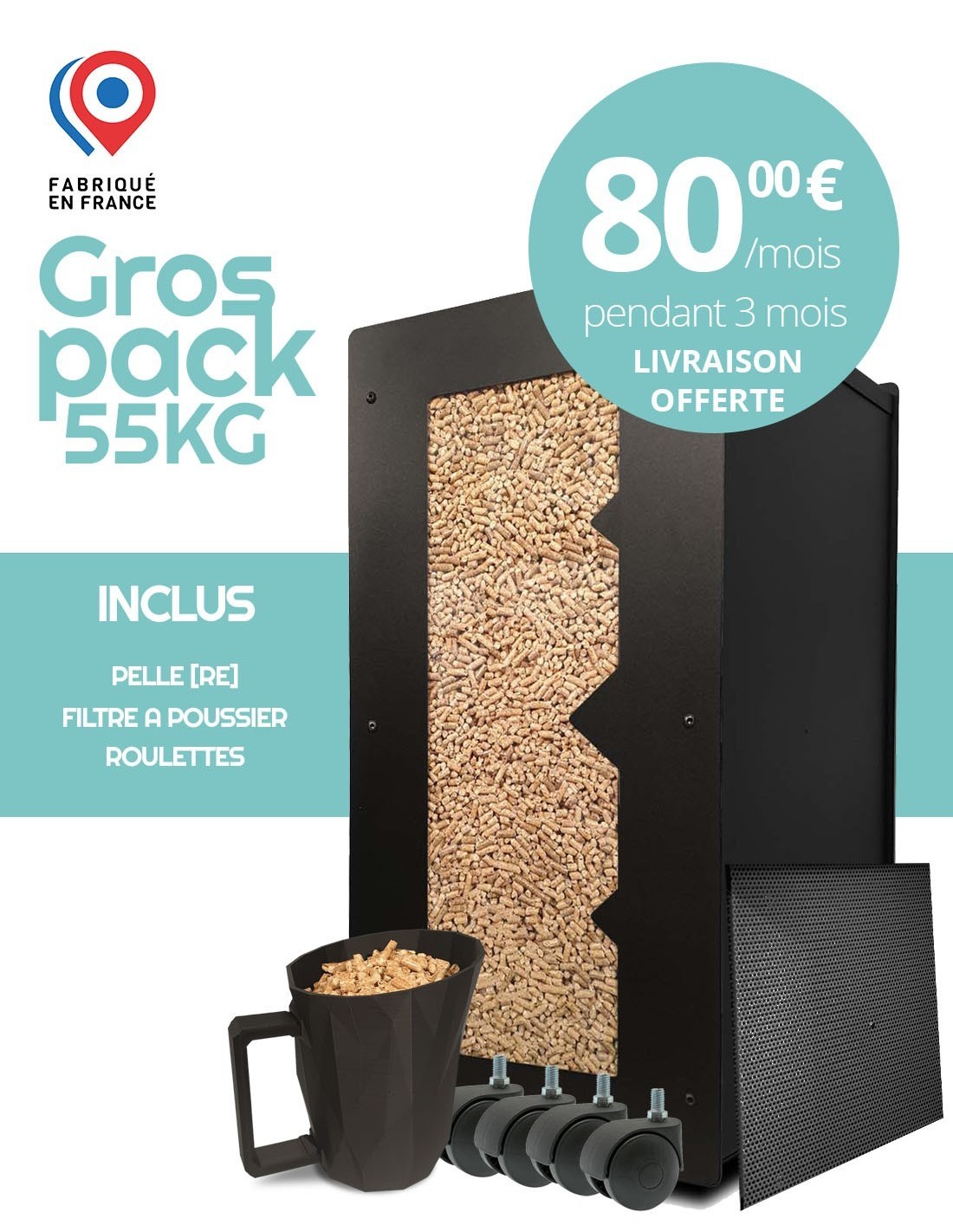 - Pellet shovel, wheels, dust filter