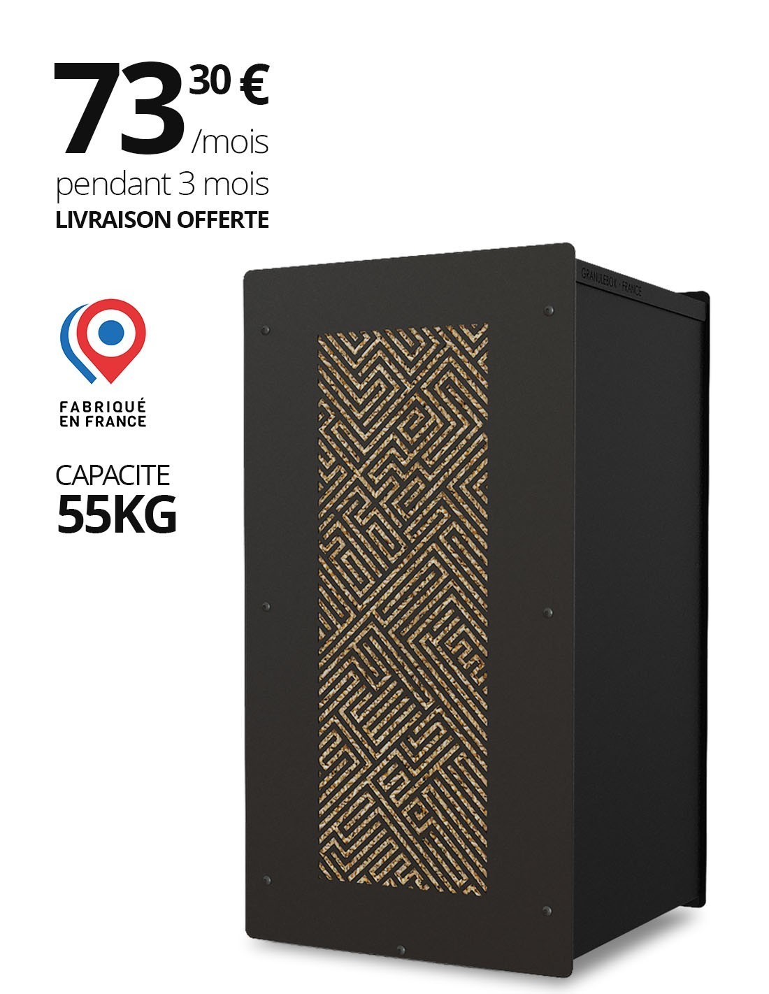 Discover the Granulebox Laby, an innovative pellet storage tank that combines design and functionality. This unique model stands out for its labyrinth pattern, adding an aesthetic dimension to your interior while offering a practical solution for storing wood pellets.