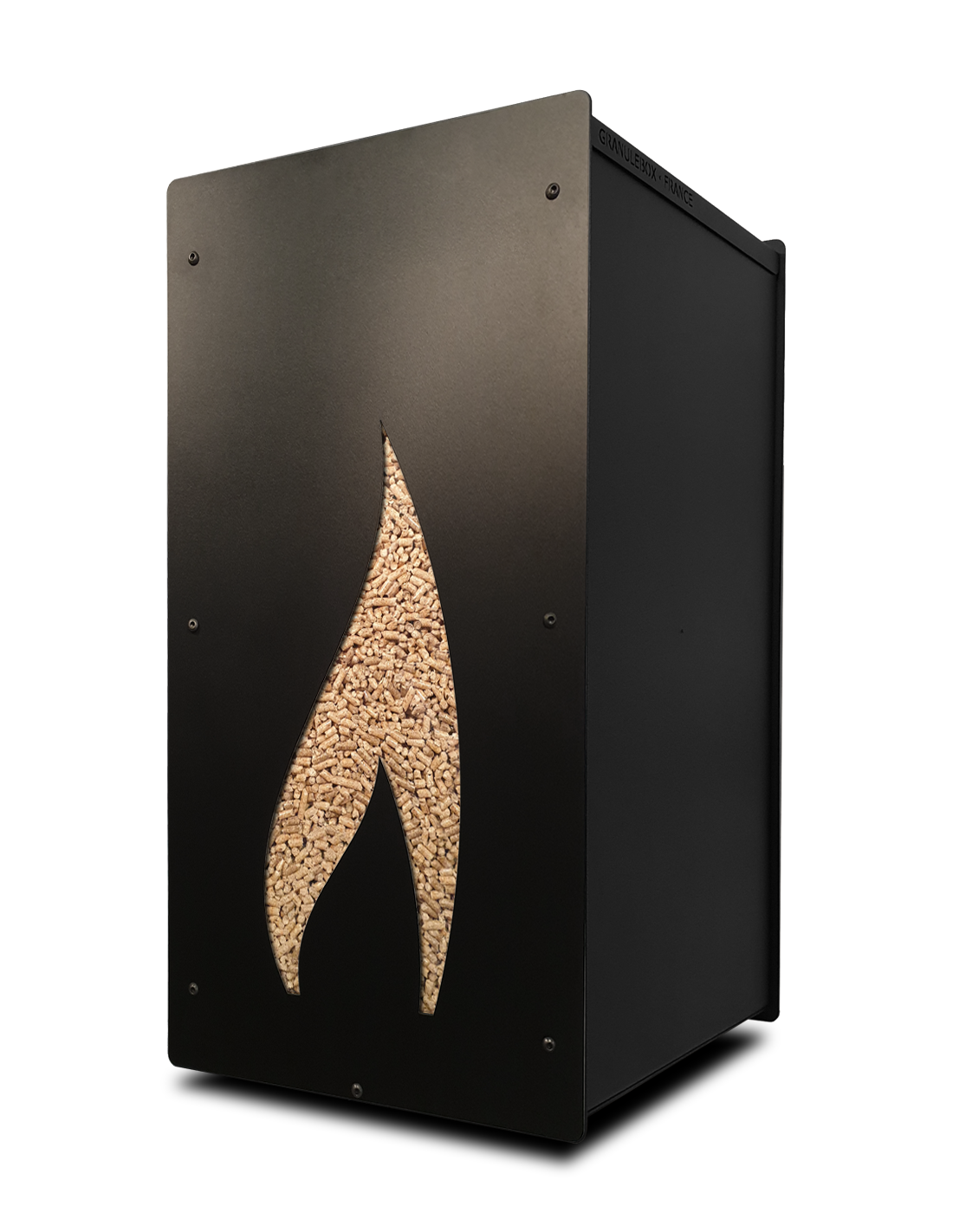 The front of the Granulebox pellet reservoir is equipped with a 4mm thick tempered glass window. This material choice allows for better durability and provides constant visibility of the pellet stock, enabling you to check the remaining level in the pellet storage at a glance. This feature is particularly useful to avoid last-minute surprises and ensure optimal management of your pellet supply for your wood pellet stove.