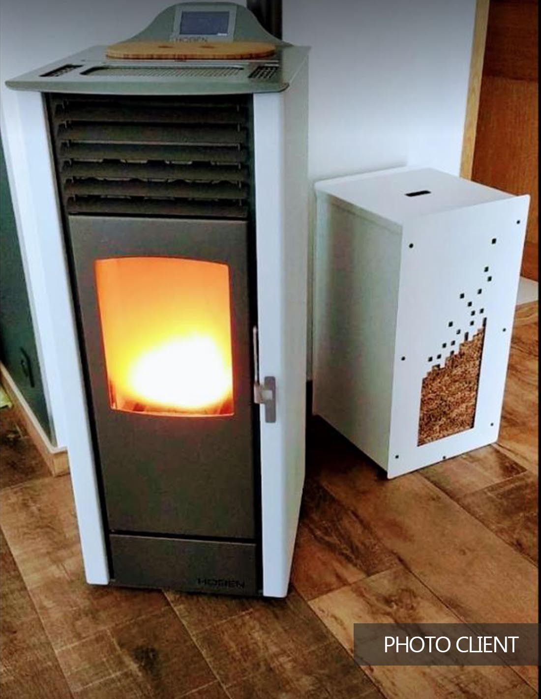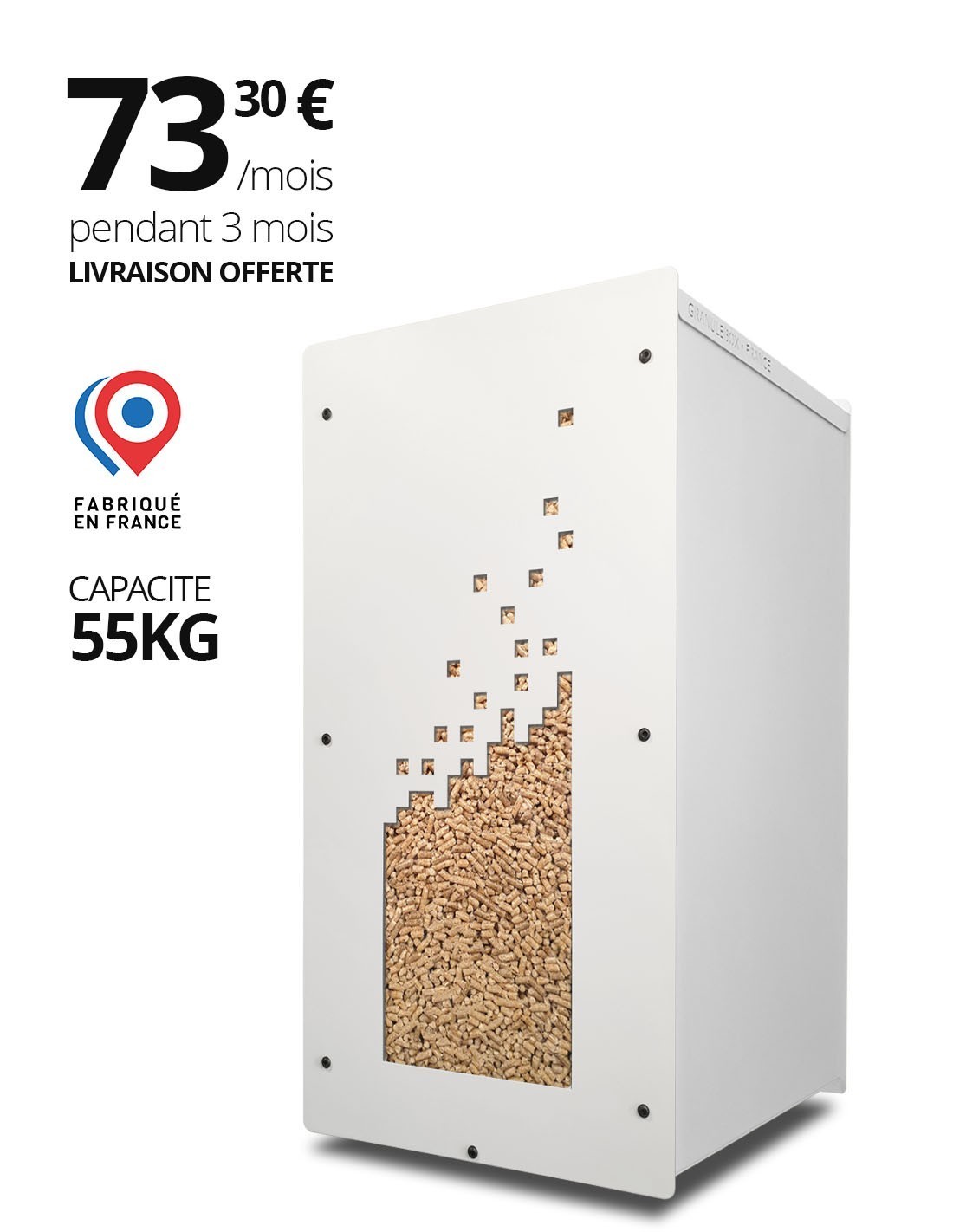 tore up to 55kg of wood pellets — over three 15kg bags — with the Granulebox Numérik, the ultimate solution for efficient and stylish pellet storage. Crafted from thick steel and finished with elegant white thermosetting paint, it combines durability with a sleek look. Say goodbye to constant trips to the bags: keep your pellets easily accessible, organized, and ready at hand, while saving time every day.