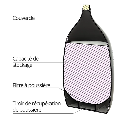 Le plus de ce meuble pour stocker votre pellets à côté de votre poêle à pellet, c'est l'intégration dans la conception du filtre à poussière avec son tiroir de récupération.